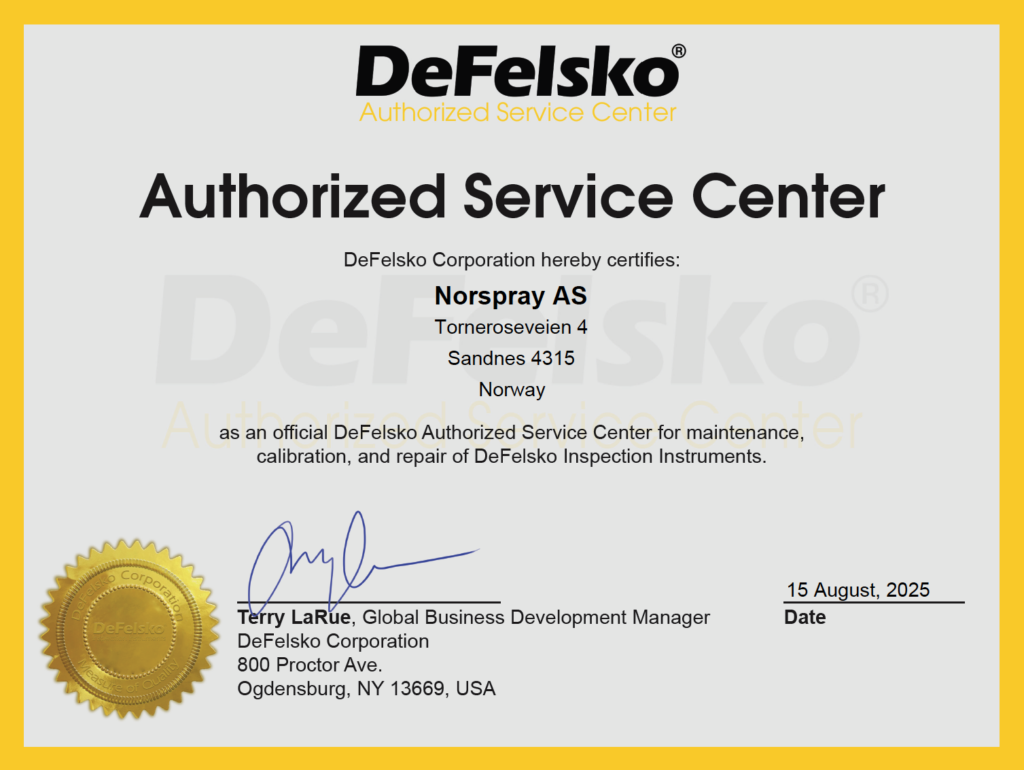 Norspray er autorisert servicesenter for DeFelsko som er en av verdens ledende produsenter av inspeksjons- og måleinstrumenter for overflatebehandling. Det betyr at vi utfører vedlikehold, kalibrering og reparasjon av DeFelsko-instrumenter i henhold til produsentens krav direkte fra Norge. Sertifiseringen er utstedt av DeFelsko Corporation og gjelder for Norspray AS.
