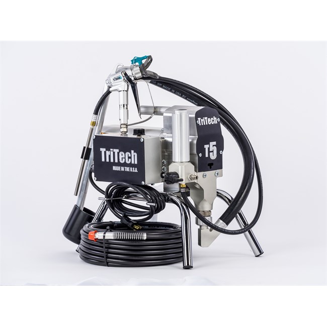 T5 er en presisjonbygd, solid og kompakt el. stempelpumpe som er ideell for mindre til mellomstore maleoppdrag. Elektronisk trykkontrollsystem gir et jevnt sprøytetrykk uten pulseringer. PMDC motor som trekker mindre ampere. Unik materialpumpe bestående av meget få deler med hardforkrommet stempelstang i rustfritt stål. Ny teknologi med kun to pakninger, en øvre og en nedre pakning. Hus/manifold i én enhet både for HT-filter og materialpumpe med ekstra stor materialpassasje. Ingen komponenter i pumpehuset/manifolden vil ruste da det er kun er benyttet komponenter i rustfritt stål og aluminium av høyeste (aereospace) kvalitet. Alle komponenter er produsert i USA, og det gis livstidsgaranti på motor og gear. T5 leveres i to modeller med sugeslange eller 6l trakt.