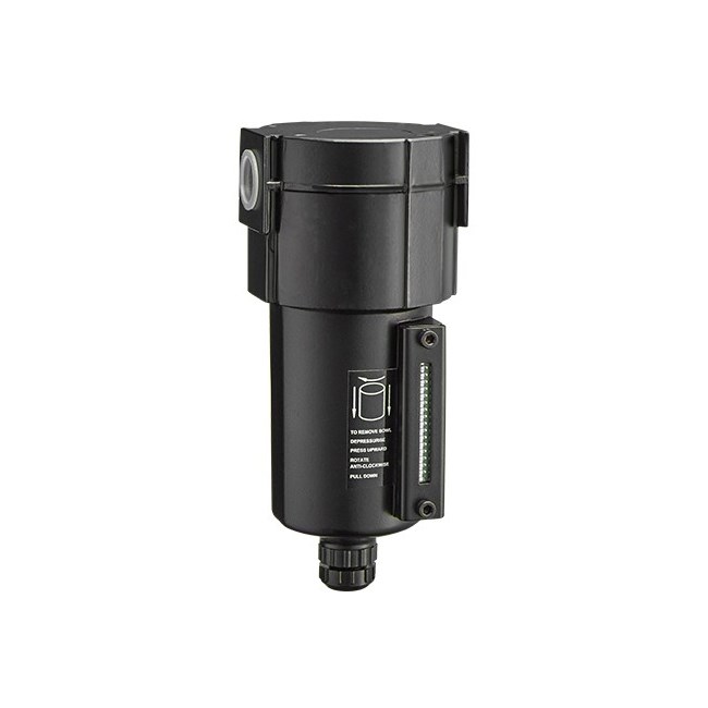 Ekstra solide vann- og oljeutskiller i metall for vedlikehold av mellomstore til store luftverktøy. Vann- og oljeutskillere leveres med keramisk element på 40 my og manuell drenering.